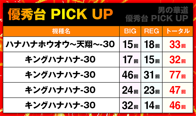 「キングハナハナ-30」からは、ボーナス回数が70回以上の台など、合計4台をチョイス。