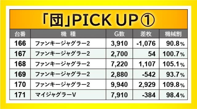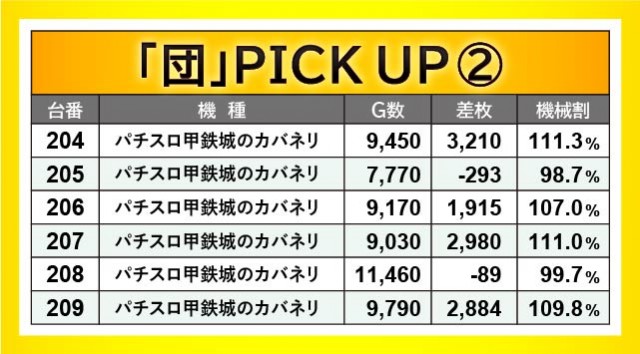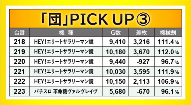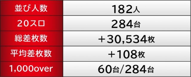 当日は横並び好況スポットを確認でき、その対象となったのが166~171番台・204~209番台・218~223番台の3ヶ所だ。いずれも全台プラス差枚を達成できなかったが、『ファンキージャグラー2』170番台+2,929枚や『パチスロ甲鉄城のカバネリ』204番台+3,210枚、『HEY!エリートサラリーマン鏡』219番台+3,670枚という大きな数字を確認でき、ファンは手ごたえを感じていたのは確かだろう。