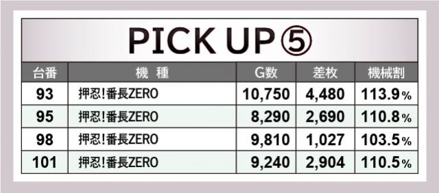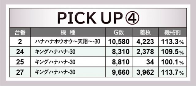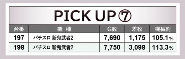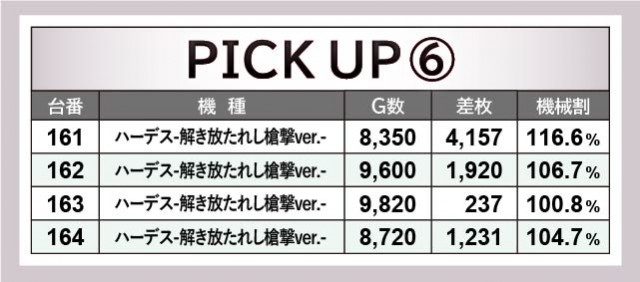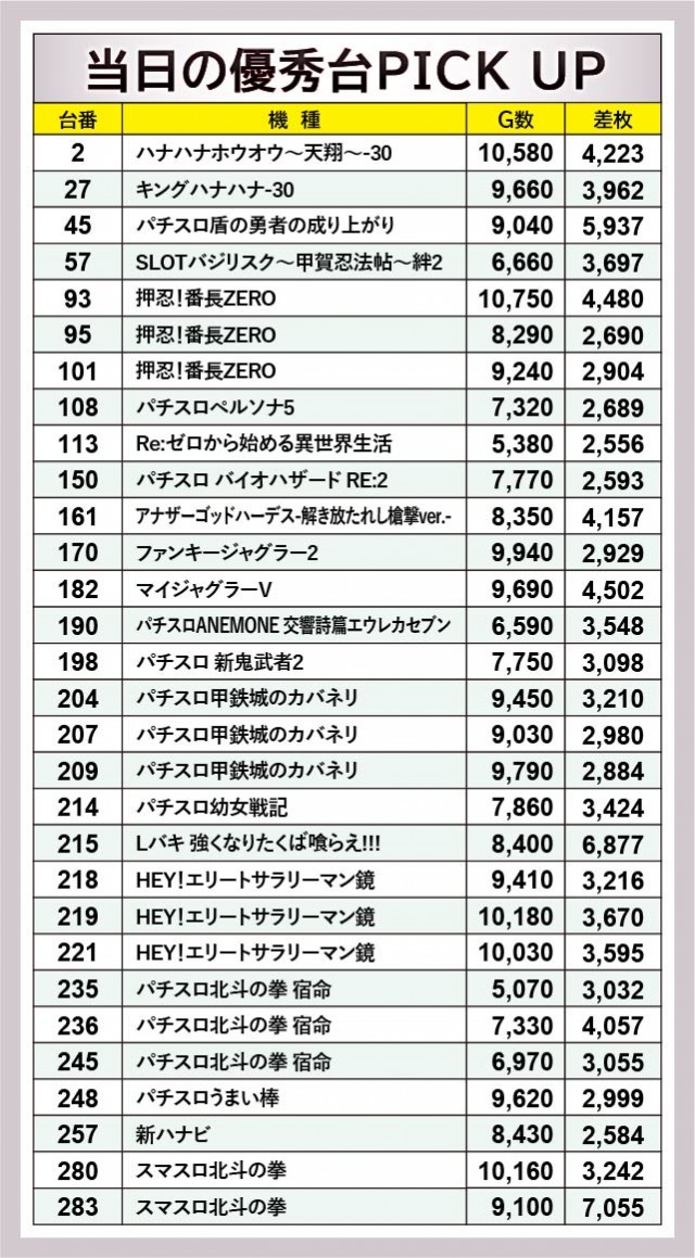 次に機種単位での活躍に注目するが、大きく目を惹くのは沖スロ『ハナハナホウオウ~天翔~-30』『キングハナハナ-30』だろう。2番台+4,223枚や27番台+3,962枚という記録から、コンスタントなBIG当選を窺うことができる。そして名機『押忍!番長ZERO』にて93番台+4,480枚が発生し、さらには新台『アナザーゴッドハーデス-解き放たれし槍撃ver.-』161番台+4,157枚を筆頭に全台プラス差枚を達成。『パチスロ 新鬼武者2』も同様に2台中2台のプラス差枚となっており、勝率100%の機種が誕生していたのも見逃せない。