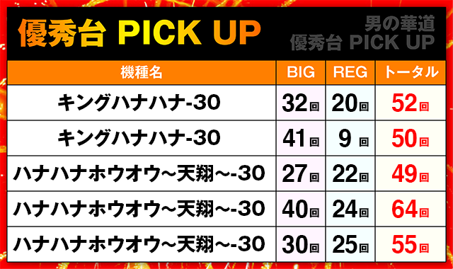 ボーナス回数が64回の台を筆頭に、「ハナハナホウオウ~天翔~-30」からは3台をチョイスした。