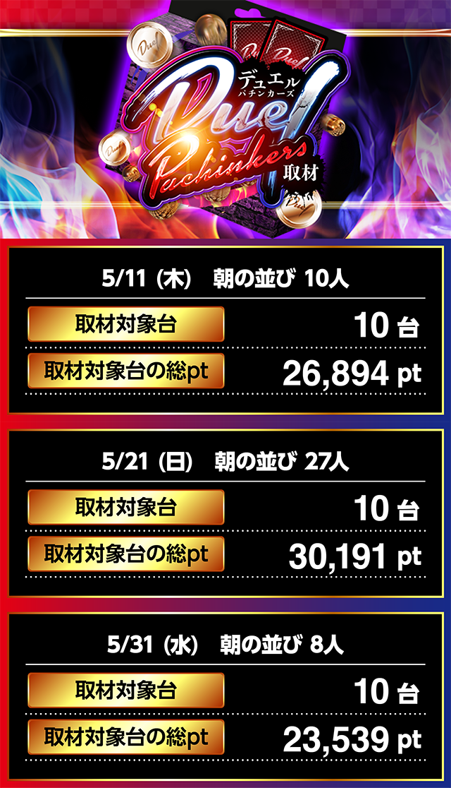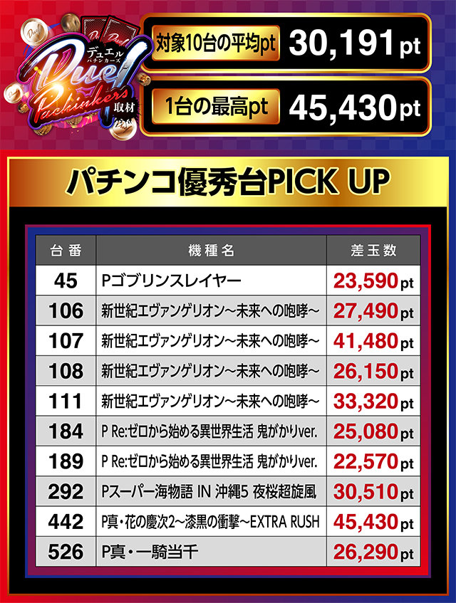ほかにも、131番台の「P北斗の拳 暴凶星」や505番台の「P牙狼GOLD IMPACT」など、複数の台が20,000ptを超えた。