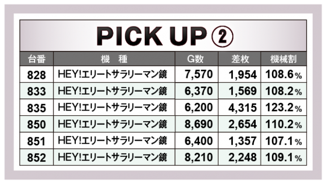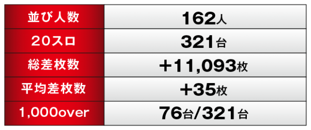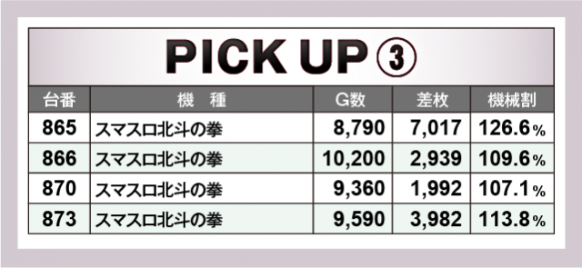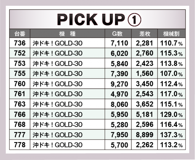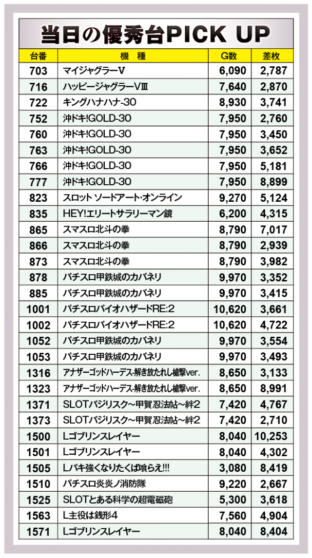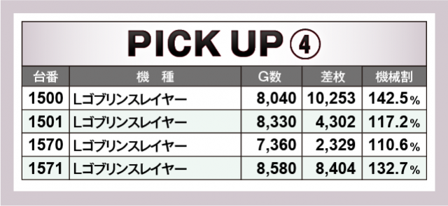 続いては好調だった4機種に注目。まず『沖ドキ!GOLD-30』では11台が+1千枚オーバーをマークし、777番台の+8,899枚を筆頭にトータル差枚数は+3万7千枚オーバーを獲得!また、『HEY!エリートサラリーマン鏡』が6台のトータル差枚数+1万4千枚オーバー、『スマスロ北斗の拳』が4台のトータル差枚数+1万5千枚オーバー、『Lゴブリンスレイヤー』では、1500番台の+10,253枚を筆頭に4台のトータル差枚数+2万5千枚オーバーをマークし、スマスロ機の威力を存分に見せつけていた。