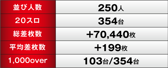 今回の取材では、総差枚+70,440枚、1,000オーバー103/354台と、安定感たっぷりの成績で20連勝を達成。これまでの取材内容を踏まえて考えれば、30連勝・40連勝してもおかしくはないホールだと断言できるので、今後の活躍も大いに期待したい! まだ同店に遊びにいったことのない人がいれば、ぜひ一度足を運んでみてほしい!