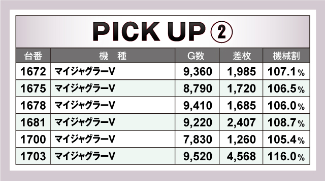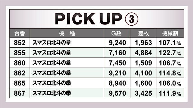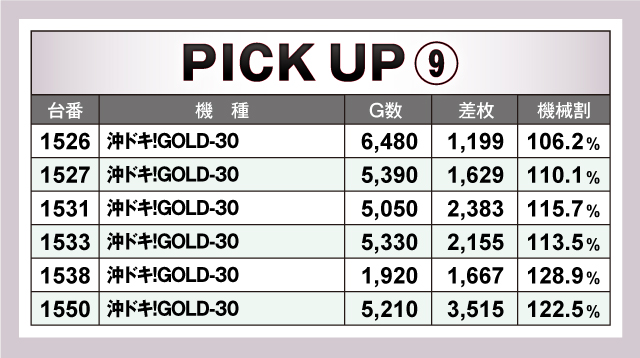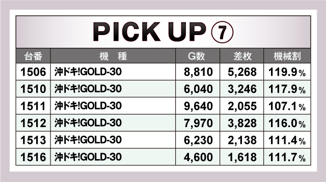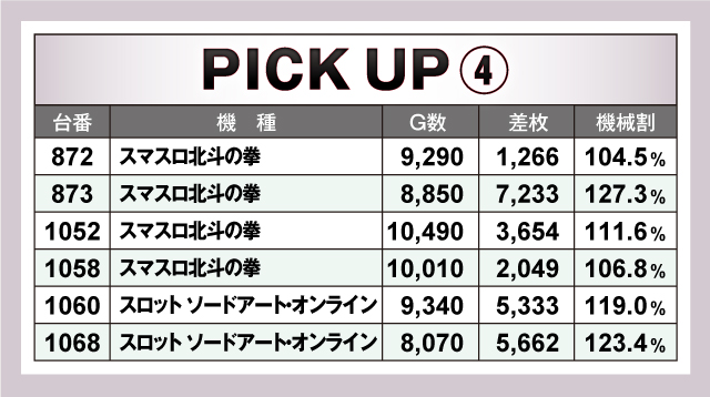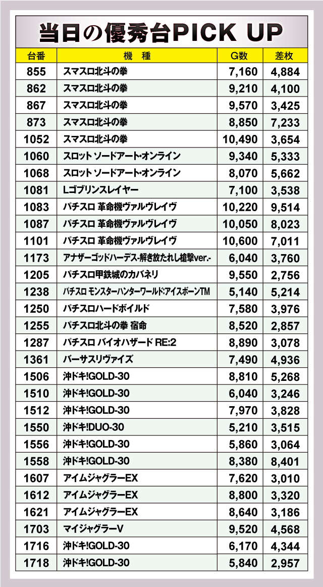 続いては、当日特に盛り上がりを見せていた全54台を紹介。どの台もハイパフォーマンスを発揮しており、楽しめる要素がふんだんに詰め込まれていた可能性が高そうだ。とくに「沖ドキ!GOLD-30」は54台中18台をピックアップしており、どの台も4ケタ以上のプラスをマーク。全体を通して、沖スロやジャグラーシリーズ等の王道機種を筆頭に、「スマスロ北斗の拳」「スロット ソードアート・オンライン」などの人気機種が賑わいを見せていた!