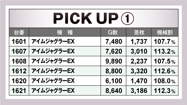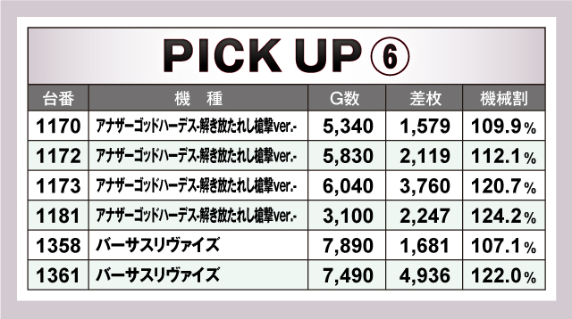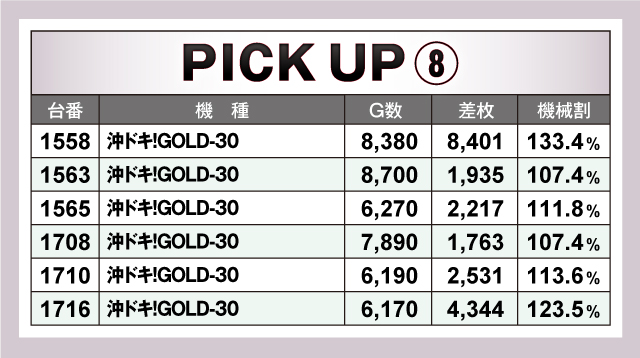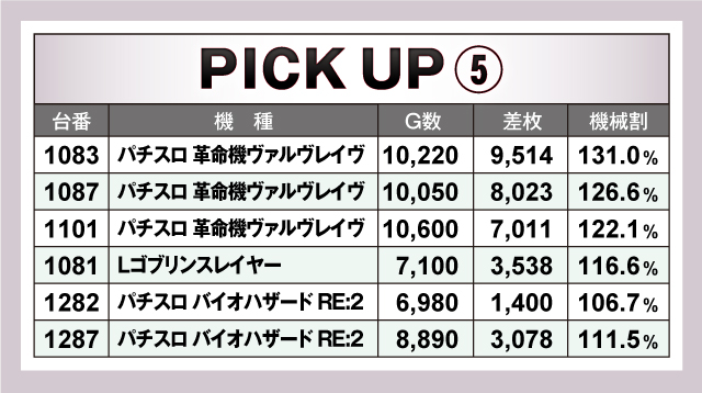 まずは優秀台30台の紹介から。30台全てが差枚数+2,700枚以上を達成しており、+3,000枚以上は27/30台、+4,000枚以上は14/30台、+5,000枚以上は9/30台と高水準の結果がズラリ。そして最優秀台は、1083番台「パチスロ 革命機ヴァルヴレイヴ」の+9,514枚、次点で1558番台「沖ドキ!GOLD-30」の+8,401枚、1087番台「パチスロ 革命機ヴァルヴレイヴ」の+8,023枚と大満足の結果となった!