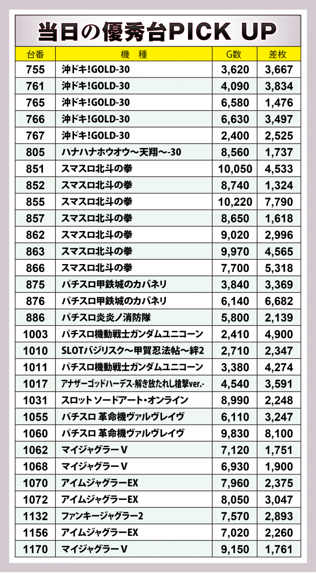 まずは優秀30台のPICK UPから。30台のうち8割弱となる23台が差枚数+2千枚以上を達成、+3千枚以上は全体の半数となる15台、+4千枚オーバーは8台、+5千枚オーバーは4台となった。後ほど挙げる好調3機種以外では、+6千枚突破を含み2台で+1万枚オーバーをマークした『パチスロ甲鉄城のカバネリ』、2台共に+4千枚を超えた『パチスロ機動戦士ガンダムユニコーン』、+3千枚オーバーを筆頭に3台トータルで+7千5百枚超となった『アイムジャグラーEX』が輝かしい成績を果たした。