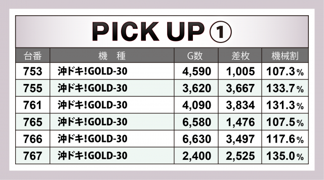 さらに前回取材でも好成績を残した『沖ドキ!GOLD-30』がこの日も快調。+3千枚突破×3で6台のトータルは+1万6千枚弱に達した。