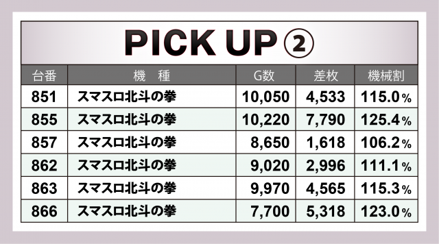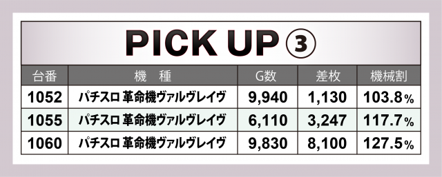 最後は当日の好調3機種計15台をピックアップ。15台全てが4桁のプラスを達成し、特にスマスロ2機種が差枚数の上で目立つ結果を残した。+8千枚到達目前台をトップに6台の合計で+2万6千枚を突破した『スマスロ北斗の拳』、+8千枚オーバー台を始めに3台合わせて+1万2千枚オーバーを達成した『パチスロ 革命機ヴァルヴレイヴ』がハイクオリティを実現した。