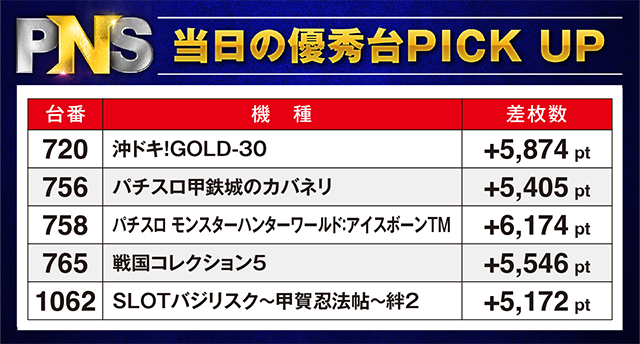 +5,000pt以上の台は、「パチスロ甲鉄城のカバネリ」と「SLOTバジリスク~甲賀忍法帖~絆2」にもアリ。