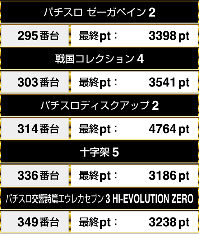 314番台の『パチスロディスクアップ2』が4764pt、303番台の『戦国コレクション4』は3541pを記録した。