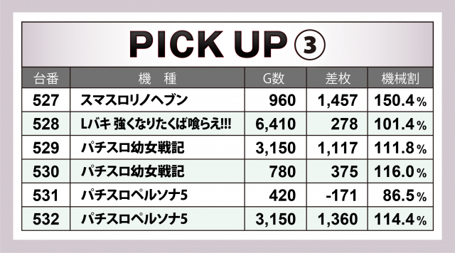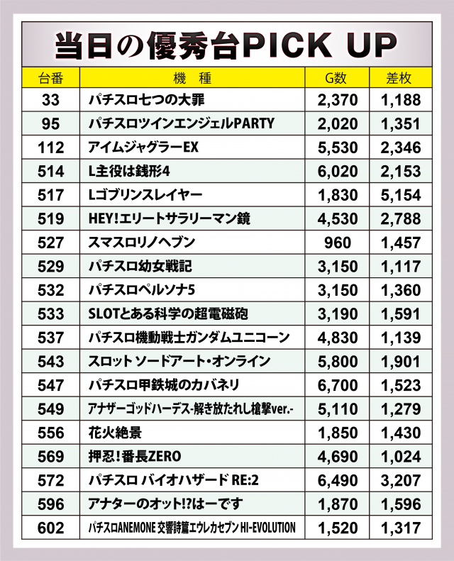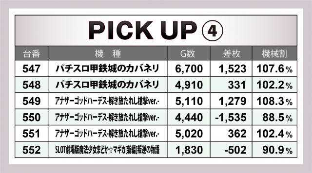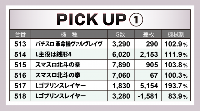 続いては4か所の横並び好況スポット計24台をチェック。全台プラスは逃したもののその4分の3がプラスを実現した。その中でも輝いたのが+5千枚オーバーを達成した『Lゴブリンスレイヤー』、その他では共に+2千枚を超えた『L主役は銭形4』『HEY!エリートサラリーマン鏡』と、いずれもスマスロ陣のハイスコアが光った。