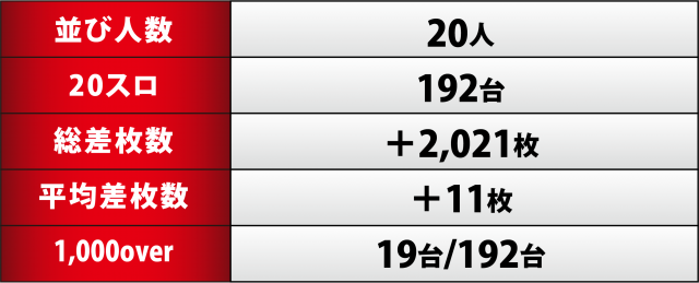 この日、20スロ192台のトータル差枚数は+2,021枚となり、前回を上回ることは叶わなかったが白星を重ねることに成功した。一方で上述した通り、1,000overの台数は他店取材では標準化している30には届かず、これが常態化していることは非常に好ましくない。早急な解消策が求められるところだ。