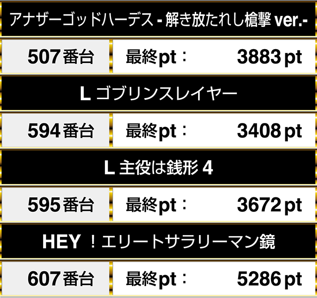 新台である『L主役は銭形4』の595番台が3672pt、『HEY!エリートサラリーマン鏡』の607番台は5286ptを記録!!