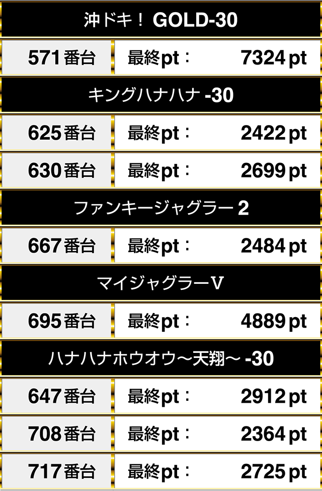 沖スロをみると、『沖ドキ!GOLD-30』の571番台が7324pt!