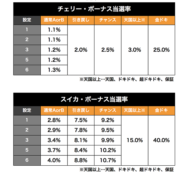 ほかにも、通常A or B滞在時のチェリーからのボーナス当選率、通常A or B・引き戻し・チャンス滞在時におけるスイカからのボーナス当選率に設定差があるのでチェックしておこう。