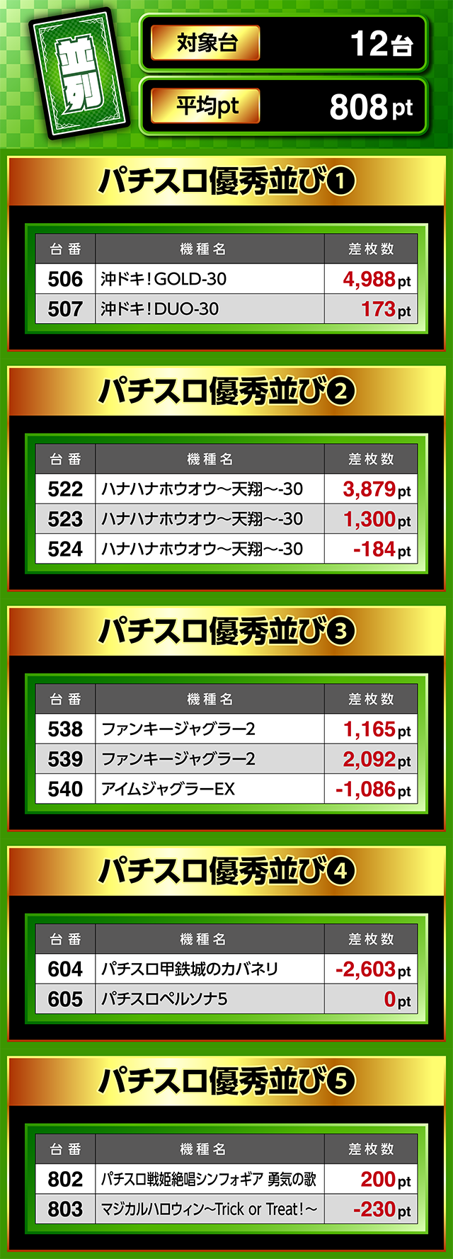 506番台の「沖ドキ!GOLD-30」が4,988pt、507番台「沖ドキ!DUO-30」もプラス!