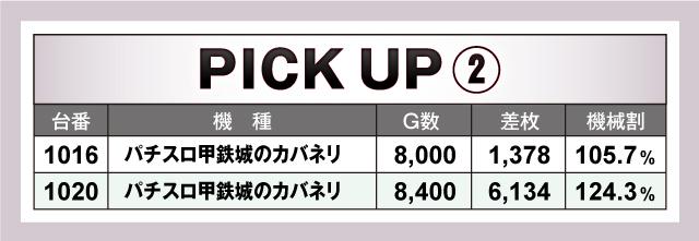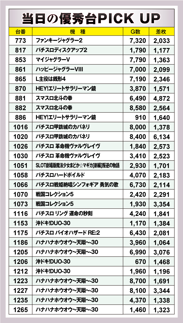 上の表は、当日盛り上がりを見せていた29台をピックアップしたもの。うち+2,000枚を超える出玉を獲得したのは29台中15台。その中での最優秀台は、1020番台「パチスロ甲鉄城のカバネリ」の+6,134枚という結果となった。全体を通して、ハイスペック機種だけではなくジャグラーシリーズや「ハナハナホウオウ~天翔~-30」といったノーマルタイプの活躍も見てとれた。