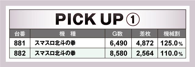 続いては当日好調だった3機種を紹介。上でも取り上げた「パチスロ甲鉄城のカバネリ」「ハナハナホウオウ~天翔~-30」の2機種のほかに、人気機種「スマスロ北斗の拳」を加えた3機種をピックアップしたが、3機種とも当日のTOPに数多くランクインしている。これら3機種が当日の盛り上がりを牽引していたのは間違いなさそうだ!
