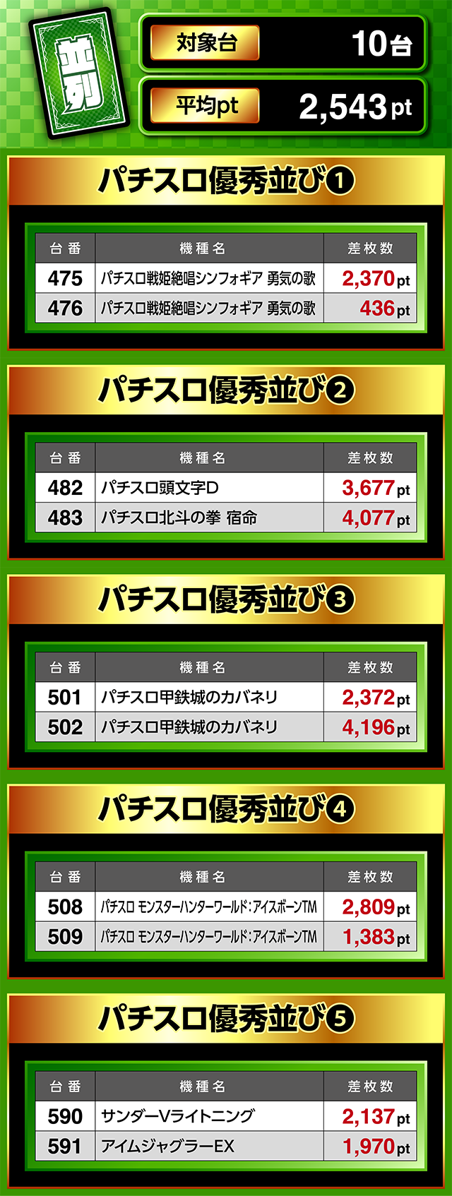 並列は、ピックアップした5ヶ所のすべての並びにプラス台が続き、483番台の「パチスロ北斗の拳 宿命」と502番台の「パチスロ甲鉄城のカバネリ」は4,000ptオーバー。