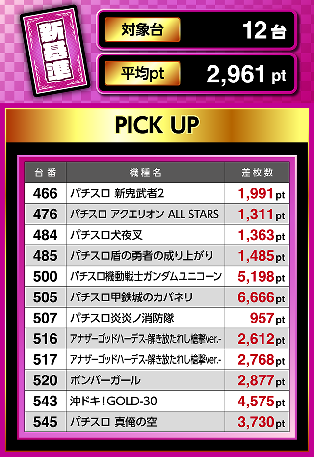 505番台の「パチスロ甲鉄城のカバネリ」が6,666ptとなり、500番台の「パチスロ機動戦士ガンダムユニコーン」は5,198ptを記録した。