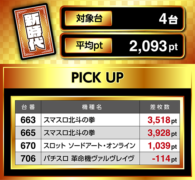 新時代は、663番台と665番台の「スマスロ北斗の拳」が3,500ptオーバー。