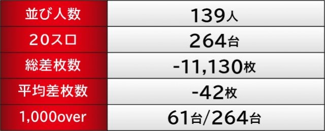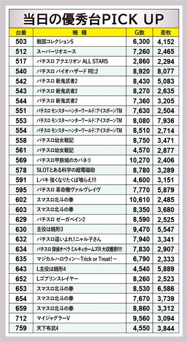 ピックアップされた30台の優秀台から、2台の万回転OVERを確認できる。朝から打ち込まれた理由は、相当な手ごたえを感じられたのは間違いなく、それは結果にも如実に表れていると言っていいだろう。また差枚数に関しても、『パチスロ バイオハザード RE:2』540番台+8,077枚や『パチスロ モンスターハンターワールド:アイスボーンTM』553番台+7,936枚、『スマスロ北斗の拳』653番台+6,586枚など、大台突破台が多数見られたのが好印象であるばかりだ。