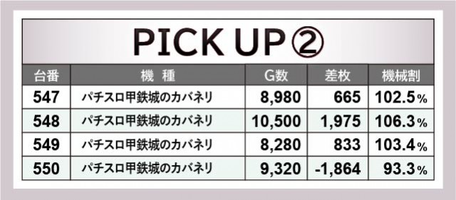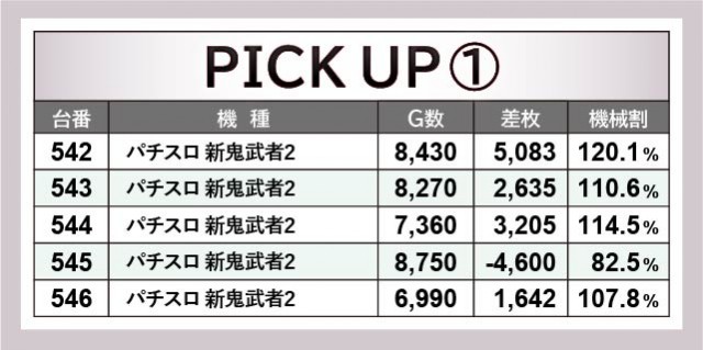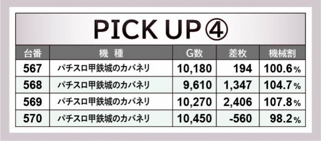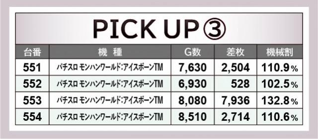『パチスロ 新鬼武者2』『パチスロ甲鉄城のカバネリ』両台は、ともに全台が大きなポテンシャルを持っていた。542番台+5,083枚や569番台+2,406枚など、人気機種らしくしっかりと結果を残しているのが印象的だ。また『パチスロ モンスターハンターワールド:アイスボーンTM』は約半数がチャンスとなり、553番台+7,936枚という記録が発生。4台横並びでプラス差枚を築いては、ファンに笑顔をもたらしていたことだろう。