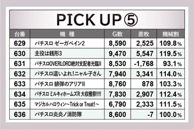 機種単位での活躍が目立つ一方、629~636番台のバラエティコーナーも存在感を放っていた。いずれの機種も打ち込まれていたのが鮮烈で、『主役は銭形3』630番台+5,547枚を筆頭に、2~3千枚OVERが続々と生まれているのが印象に残る。単体の好記録では見逃してしまう恐れがあるが、好調台が横並びになることでファンも察知しやすかったことだろう。