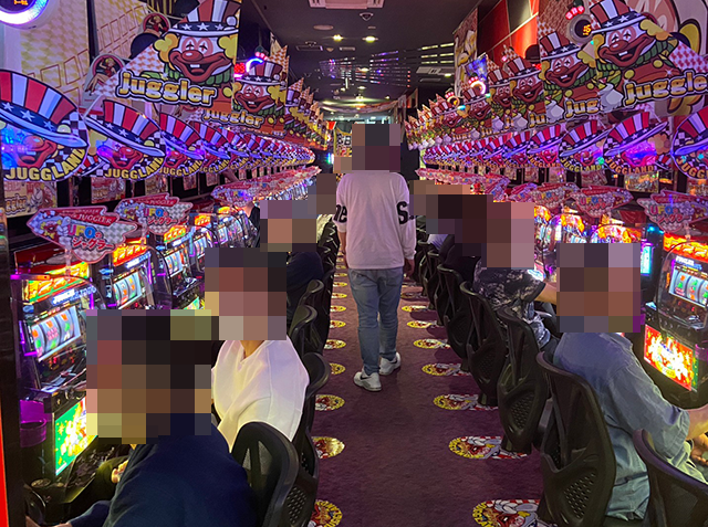 開店直後のパチスロコーナーでは、スマスロと新台がいち早く満席。