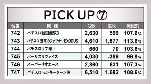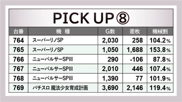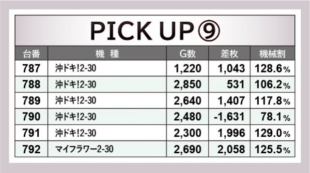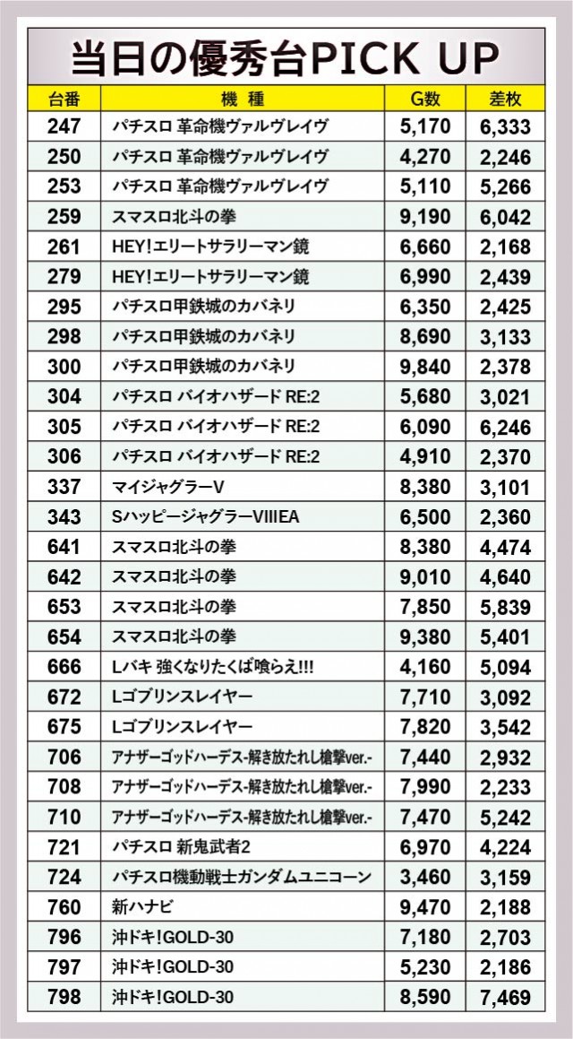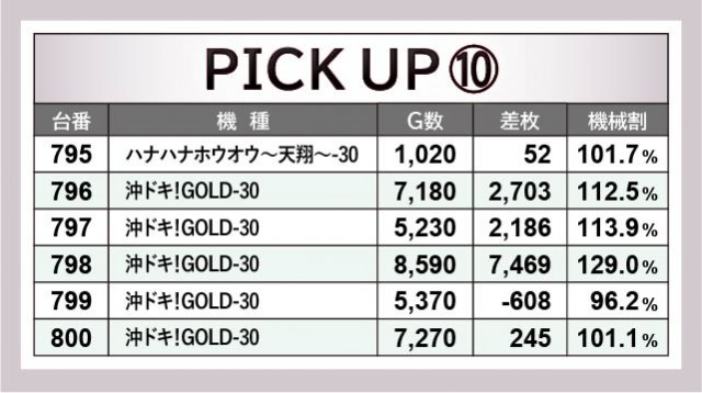 742~747番台のバラエティ機種にもチャンスが眠っており、気付いたファンはあまり多くなかったようだ。プラス差枚を達成しているが、その可能性にいち早く気づきたかったところだ。そして沖スロ機種の活躍も大きく、その最たる例が『沖ドキ!GOLD-30』798番台+7,469枚だ。796~797番台は消化ゲーム数も多く、しっかりとファンがポテンシャルに気づいていたため、順当な記録が生まれたと言えるだろう。