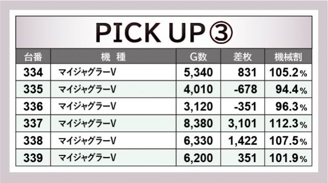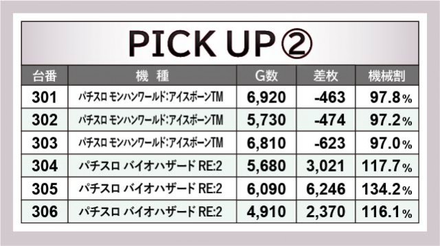 『パチスロ甲鉄城のカバネリ』は朝から閉店まで打ち込まれるだけでなく、298番台+3,133枚などの大きな熱量を放っていた。『パチスロ バイオハザード RE:2』も同様で、こちらは305番台+6,246枚という大台突破台を確認でき、ファンは盛り上がりによって自信を深めていたのかもしれない。もちろん王道機種『マイジャグラーⅤ』からも337番台+3,101枚という記録が発生し、存在をアピールしていたのも見逃せない部分だ。