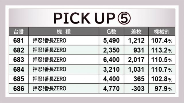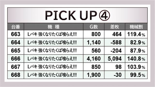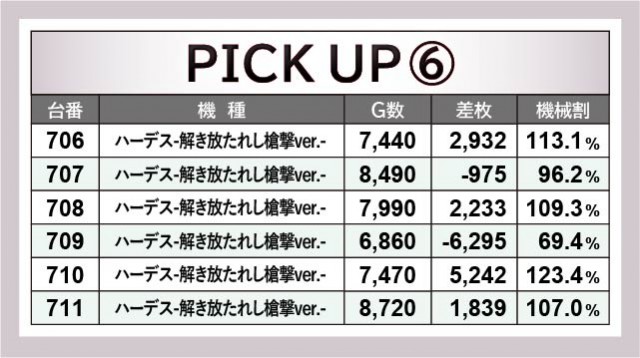 『Lバキ 強くなりたくば喰らえ!!!』666番台+5,094枚や『アナザーゴッドハーデス-解き放たれし槍撃ver.-』710番台+5,242枚など、こちらでも大きな熱気を放つ台が見られた。後者は消化されたゲーム数も多く、人気機種ということも相まって、打ちこまれていた様子に好感を覚えるばかり。また『押忍!番長ZERO』もコンスタントな大当りが発生しており、遊技していたファンは有意義な時間を過ごせたことだろう。