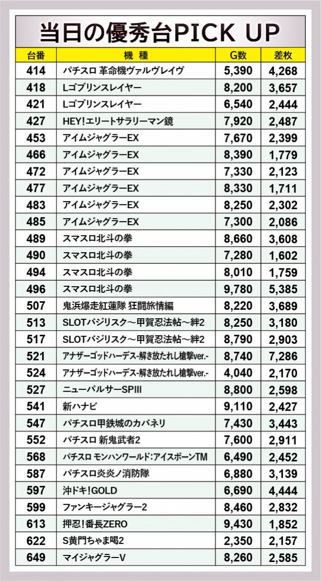 『アイムジャグラーEX』『スマスロ北斗の拳』が多く名を連ねた結果だが、それ以上に多くの機種にチャンスが眠っていたと窺える状況だ。『パチスロ 革命機ヴァルヴレイヴ』414番台+4,268枚や『アナザーゴッドハーデス-解き放たれし槍撃ver.-』521番台+7,286枚、『沖ドキ!GOLD』597番台+4,444枚など、大きな記録を残しているのが目に焼きつく。そのほかの機種でも2~3千枚OVERがコンスタントに発生しており、当日の館内は打ちごたえのある環境が整っていたと言えるだろう。