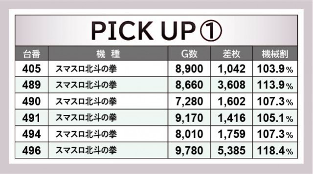 『スマスロ北斗の拳』はいずれも朝から閉店までじっくりと打ち込まれ、誰もがレバーを力強く叩いていたことだろう。その中で489番台+3,608枚や496番台+5,385枚など、大きな熱量を放っていた様子も見逃せない。世間を賑わせている超人気機種であるだけに、これぐらいは当然と言ったところだろうか…いや、同店だからこそ為せば業で、これからも懇切丁寧に扱っていくのは間違いない。