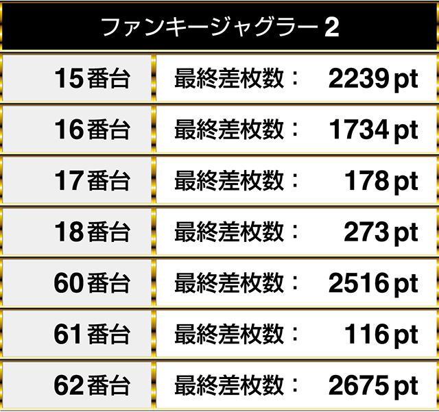 『ファンキージャグラー2』のプラスptの割合は58%で、3台以上が2000ptを上回った。