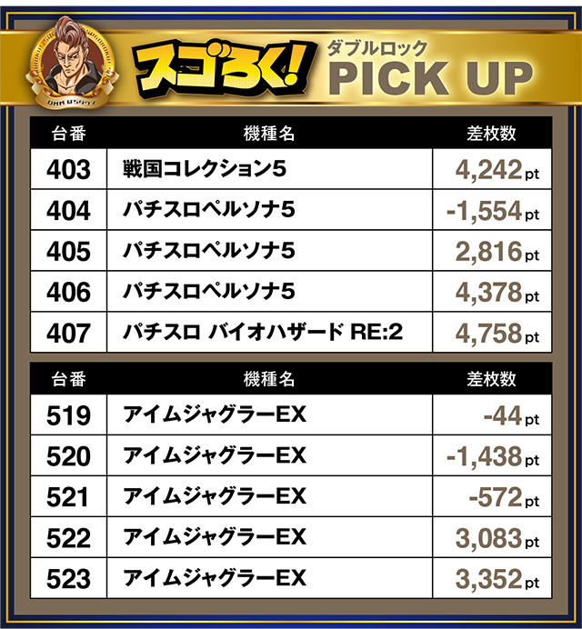 403番台の「戦国コレクション5」と406番台の「パチスロペルソナ5」、407番台の「パチスロ バイオハザード RE:2」は4,200ptオーバーだ。