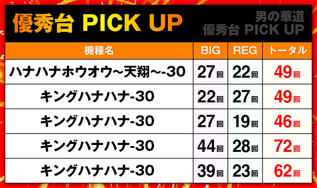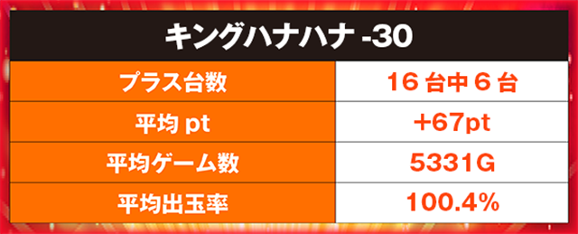 「キングハナハナ-30」で選んだ2台のボーナス回数が60回を超えており、72回を記録した台もあった。