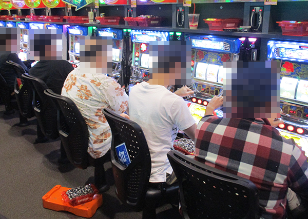 お昼を過ぎた頃の20円パチスロをみてみると、「ミリオンゴッド-神々の凱旋-」や「沖ドキ!」などのAT・ART機が大活躍。魅力的なパフォーマンスを披露しているプレイヤーが多く、鮮やかな光景もみることができた。