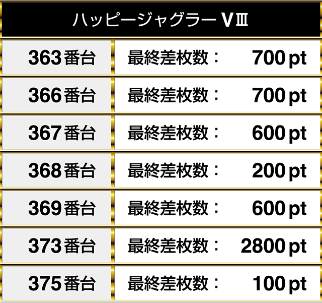『ハッピージャグラーVⅢ』は13台中7台がプラスptとなり、2800ptを記録する台もあった。