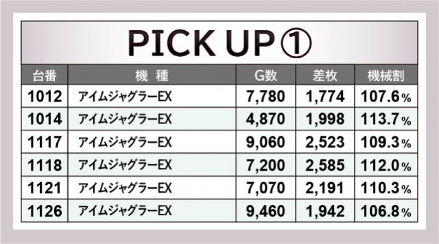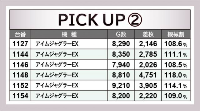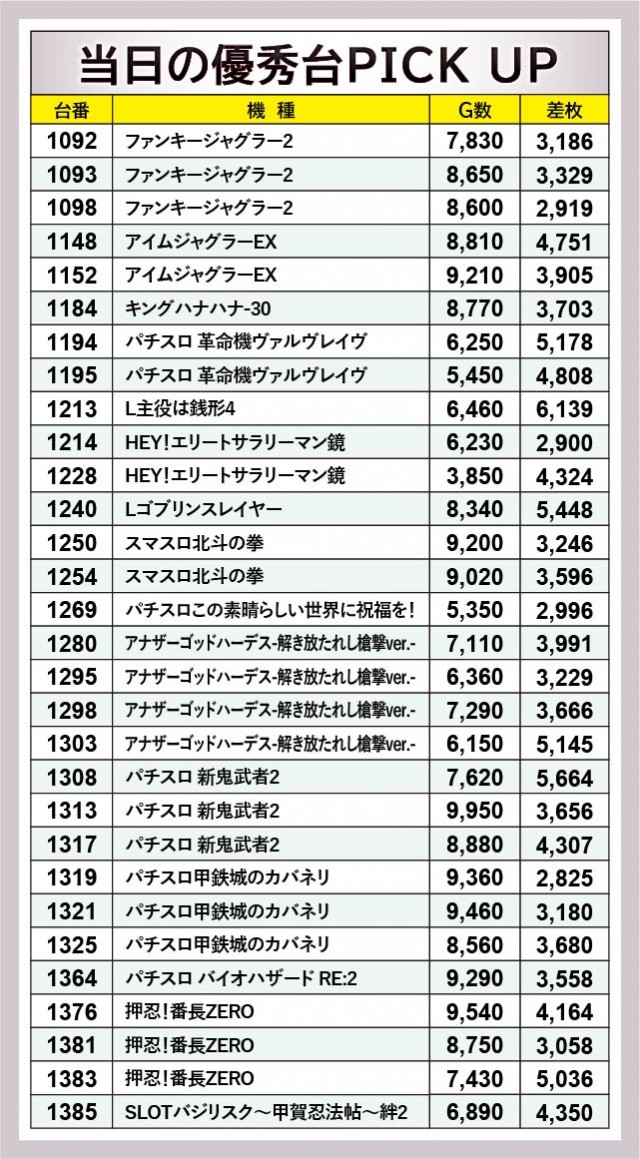 優秀台にも名を連ねている『アイムジャグラーEX』からは1148番台+4,751枚や1152番台+3,905枚など、大きな山を築いた台が見られた。そのほかにも2千枚OVER台が数多く、同店が同機種に対して並々ならぬ気合いを入れていた様子が分かるはずだ。ファンのそれを感じ取り、しっかりと終日打ち込んでいたため、鮮烈な記録を生んだと言えるだろう。懇切丁寧に扱っていることも分かり、今後とも要注目の機種であるのは間違いない。