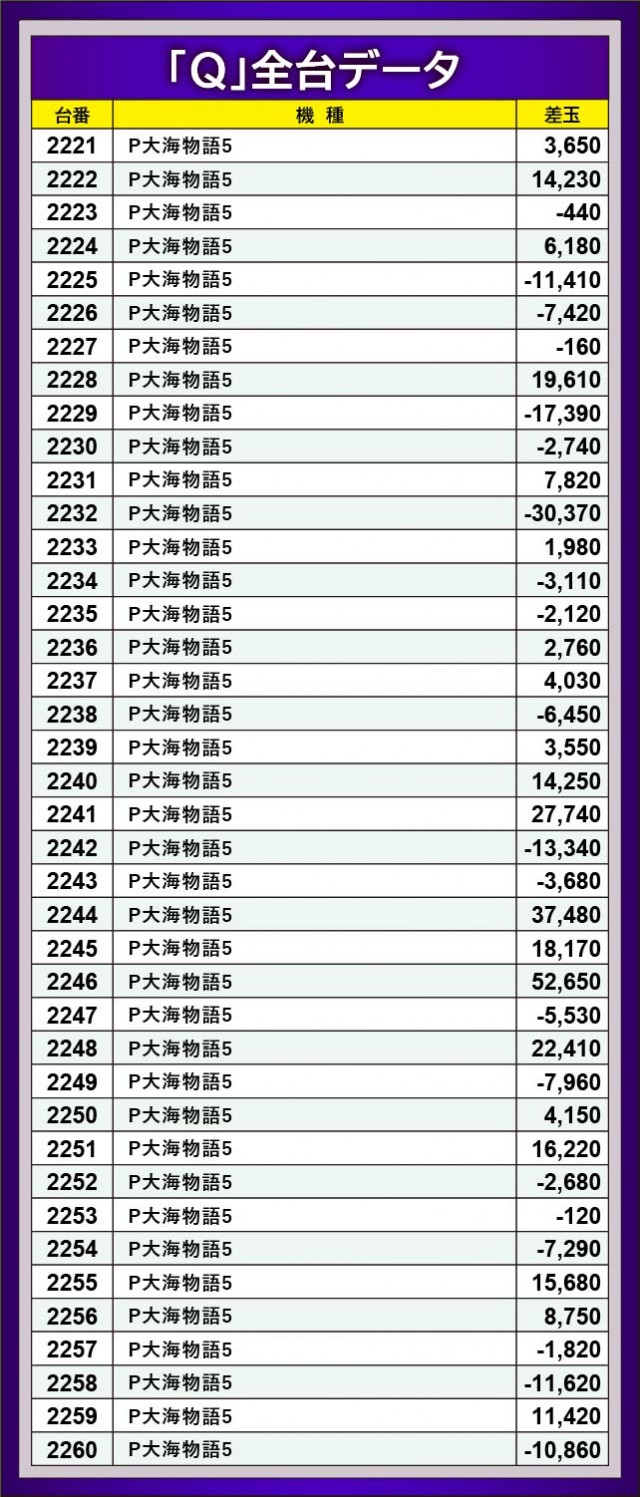 王道機種である『P大海物語5』では、2246番台+52,650玉という凄まじい熱気を放つ台が生まれた。ほかにも2241番台+27,740玉や2244番台+37,480玉といった記録を確認でき、コンスタントな初当りだけでなく、大連チャンが発生していた様子が窺える。また高い稼働を維持していたのも印象的で、ファン諸氏が厚い信頼を寄せているのも頷ける数字となった。