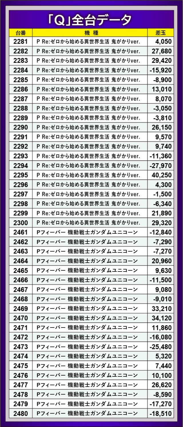 『P Re:ゼロから始める異世界生活 鬼がかりver.』2295番台+40,250玉・『Pフィーバー 機動戦士ガンダムユニコーン』2470番台+34,120玉など、これら2機種も凄まじい熱気が島を包み込んでいた。印象的なのは数多くの2万発OVER台が発生している点で、まとまった出玉を獲得したファンは恍惚の表情を浮かべていたことだろう。両機種とも現役屈指の人気機種であるため、来店時は目が離せない存在と言える。