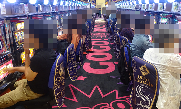 ジャグラーシリーズや「ヱヴァンゲリヲン~魂を繋ぐもの~」などのボーナスタイプにも空き台はほとんど見当たらず、にぎわいが大きい。