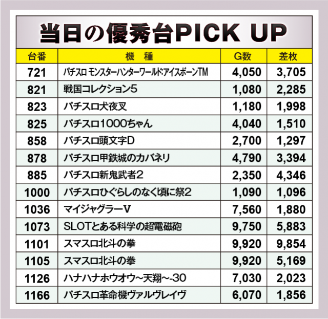 まずは優秀14台のPICK UPから。後述する好調機種以外では、885番台の『パチスロ新鬼武者2』で+4,346枚、878番台の『パチスロ甲鉄城のカバネリ』で+3,394枚、721番台の『パチスロ モンスターハンターワールド:アイスボーンTM』で+3,705枚をマークし、6.5号機の活躍が光っていた。