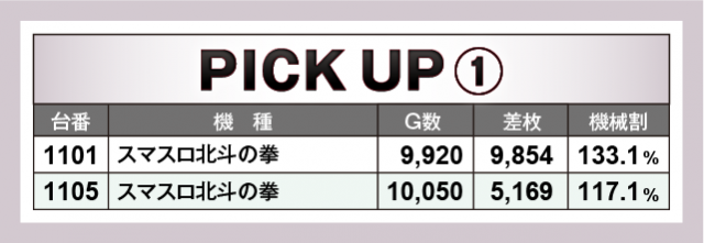 続いてはこの日のトップ差枚数を叩き出した『スマスロ北斗の拳』が好調機種として名を挙げた。1101番台の+9,854枚、さらに1105番台で+5,169枚をマークし、2台のトータル差枚数は+1万5千枚オーバーを記録。人気機種ともあり大きな熱気を放ち、店内の盛り上がりに大きく貢献していた。