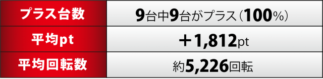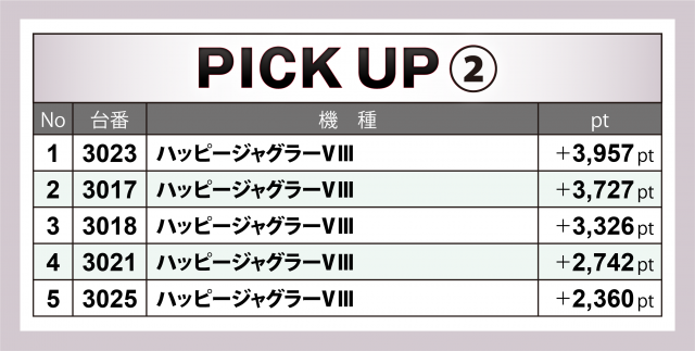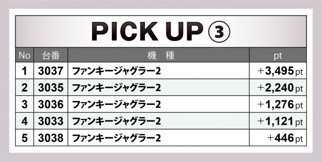また、同じくジャグラーシリーズでは『ファンキージャグラー2』5台も勝率100%を成し遂げ、合計ptは+8千5百枚をクリア。トップの3037番台は3千5百近いポイント数に終わった。