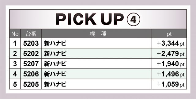 最後は惜しくも全台プラスを逃したが高勝率の『新ハナビ』6台。マイナス台以外の5台は全て4桁のプラスで終え、合計ptは+1万に迫った。