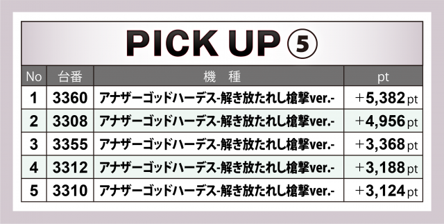 『カバネリ』『ハピジャグ』に次いだ合計pt+1万4千超となったのが新台導入間もない『アナザーゴッドハーデス-解き放たれし槍撃ver.-』20台だ。トップ5では上位2台のポイントが+5千クラス、残り3台は+3千を超えた。