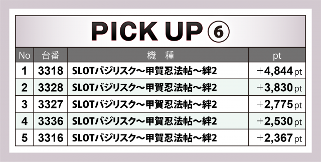 『ハーデス槍撃』に次いだのがベテランマシンの『SLOTバジリスク~甲賀忍法帖~絆2』20台。合計ptは+1万4千弱、上位5台は+4千クラス×2・+2千超×3という結果に。