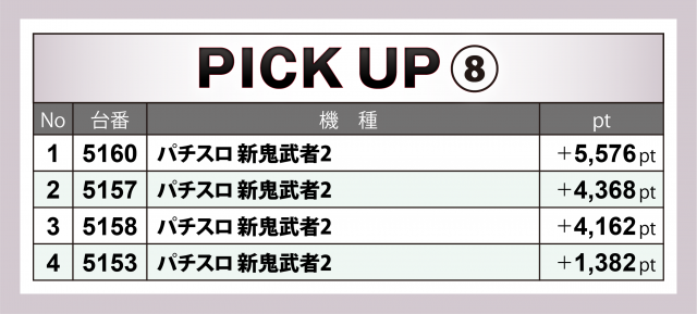 合計pt数で5桁を残した機種はまだまだあり。『パチスロ 新鬼武者2』は6台合わせて+1万1千超、ハイスコア台は+5千超×1・+4千超×2という結果に。